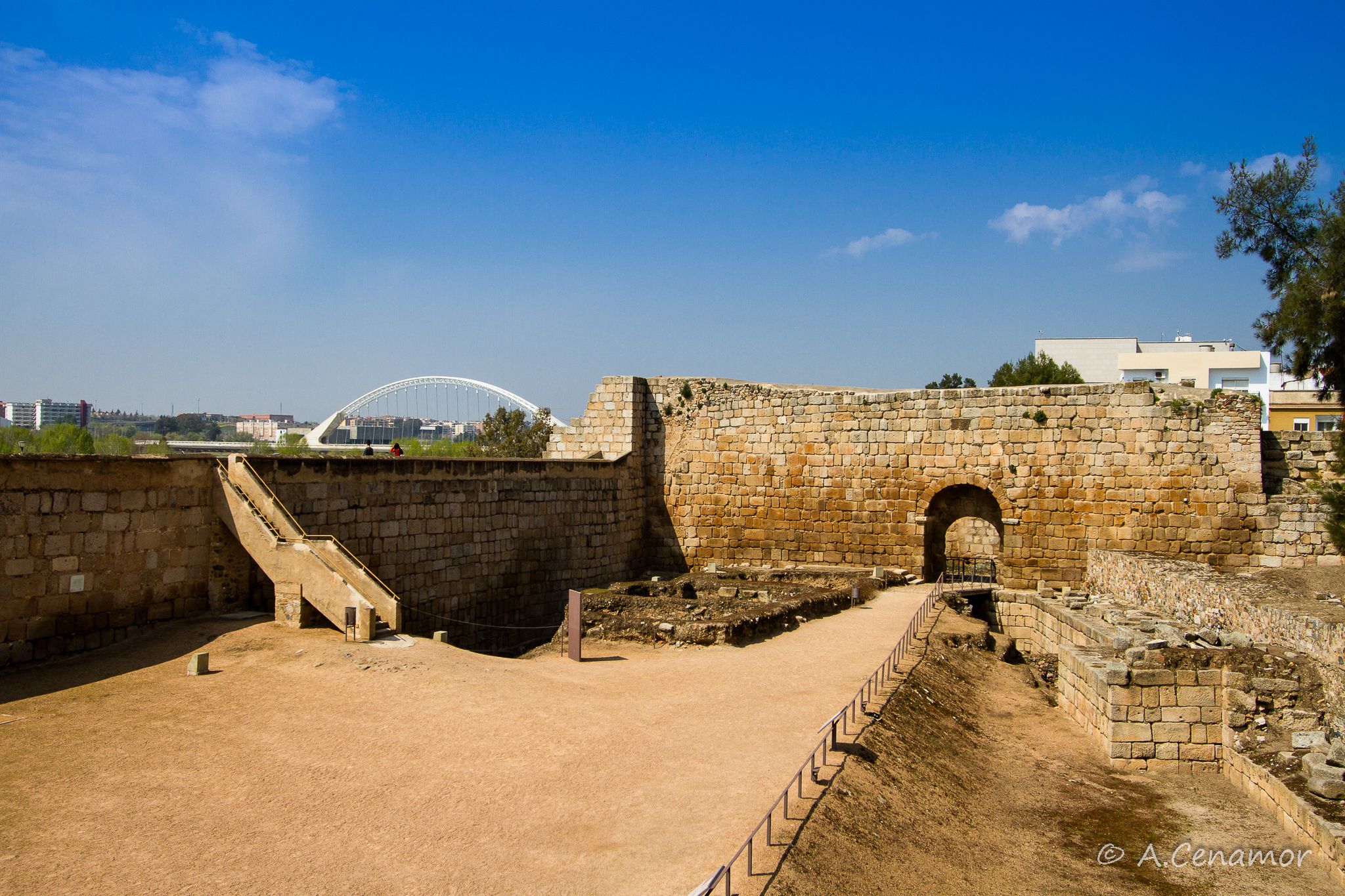 Construida por Abderramán II en el año 835 d. C. como bastión para controlar la ciudad, que desde el año 805 se había rebelado continuamente contra el dominio emiral. Primera Alcazaba Árabe de la Península Ibérica. Es una construcción compleja, que consta de un gran recinto cuadrado de 130 metros de lado capaz de albergar un buen número de tropas. En su interior se encuentran un aljibe, edificio singular compuesto de una cisterna de agua filtrada desde el Guadiana a la que se accedía con un doble corredor desde el piso bajo de una torre. El perímetro de