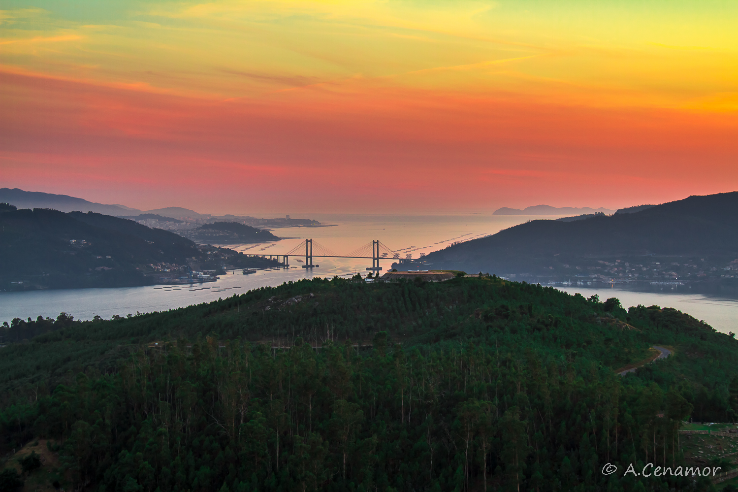 Ahí está! es el puente de Rande que une Moaña y Redondela, dibujando en el horizonte su grandiosa silueta entre las bateas de mejillones y separando la ría del Atlántico. Al fondo la ciudad de Vigo y más a la derecha en el horizonte las Islas Cies.