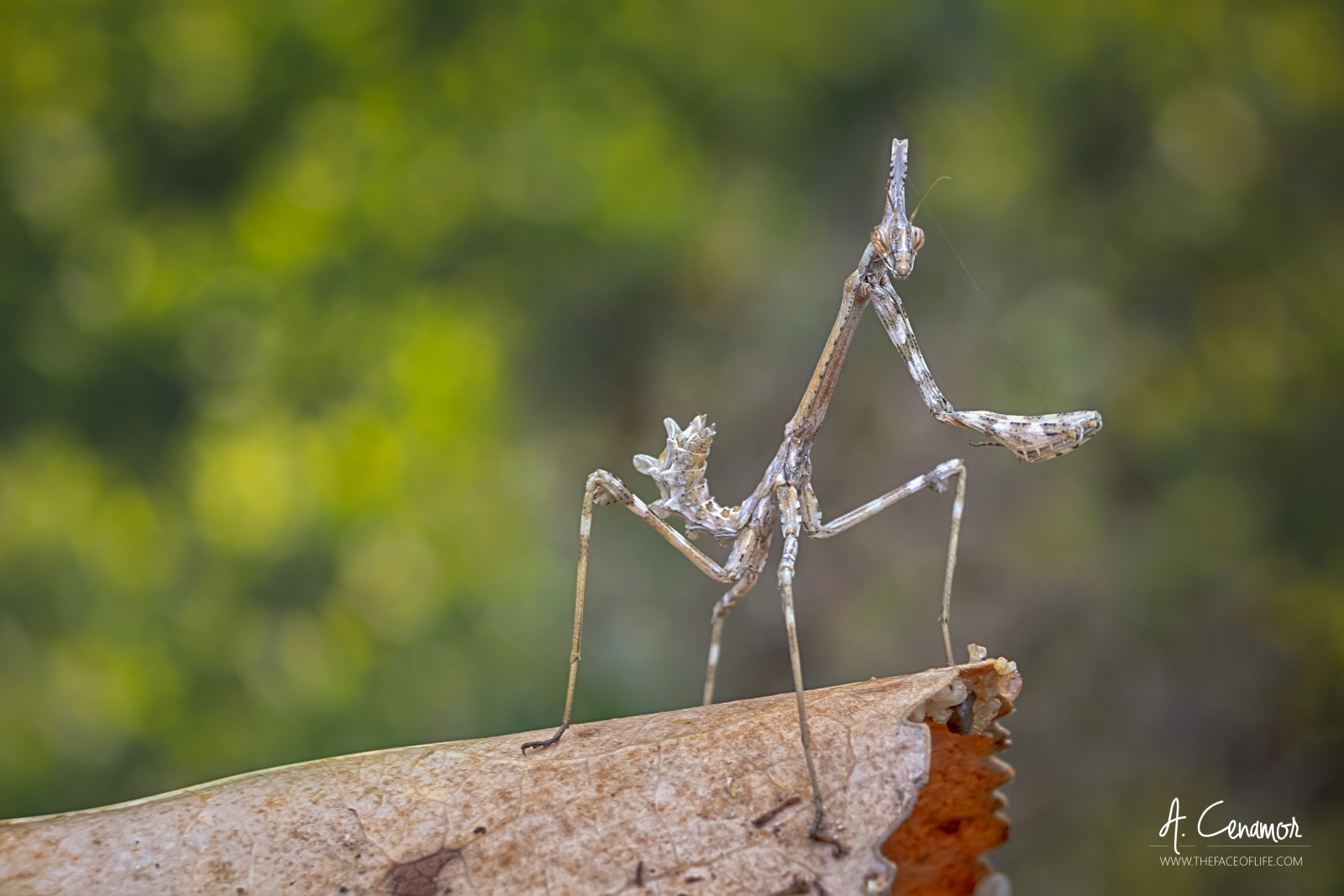 Esta mantis es una especie estilizada, presenta una cabeza pequeña con una protuberancia entre las dos antenas, un tórax largo y delgado y un abdomen pequeño que en ocasiones las ninfas lo curvan hacia arriba. El primer par de patas se localiza en la parte anterior del tórax, mientras que las otras cuatro se localizan más abajo. Los adultos poseen alas, pero las ninfas no. Ambos se caracterizan por las rugosidades en la cutícula, así como su color tan variante, que las camufla con gran variedad de plantas en las que habitan. Los machos adultos tienen antenas plumosas y la capacidad de alzar el vuelo, a diferencia de las hembras, que son de mayor tamaño y les cuesta alzar el vuelo y tienen antenas filiformes. Los adultos aparecen en primavera y pasan el invierno como ninfas, a diferencia de otras especies como Mantis religiosa, cuyos adultos aparecen entre finales de verano y principios de otoño y cuyas ninfas nacen desde principio a fin de la primavera. La variedad de colores en esta especie es enorme y depende del color del entorno, aunque en el caso de ser cuidadas en cautiverio y no tener colores en los que fijarse, podrían guiarse por el nivel de humedad del ambiente, tal y como pasa en especies como Phyllocrania paradoxa por ejemplo. Sus colores pueden ser casi negros, grises, marrón oscuro y claro, verdes-rosas o moradas (nunca verdes enteras) y amarillentas u ocres. Su color lo pueden modificar paulatinamente en cada muda de su exoesqueleto.