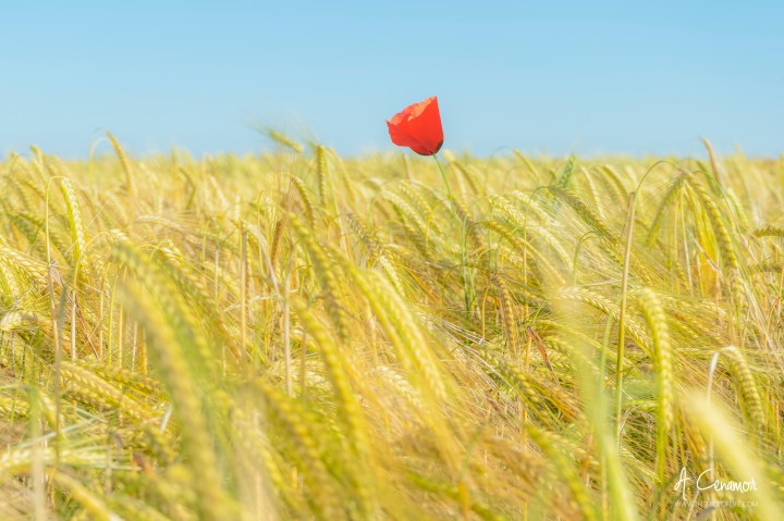 La primavera está transcurriendo como lo que es, una estación de transición entre el frío y el calor, con abundantes lluvias, temperaturas intermedias y días soleados. Después de unos días desapacibles muy nubosos y cargados de lluvias, hoy salió el sol y me decidí a dar un paseo por los alrededores de la ciudad. Los campos están exuberantes de vegetación y los cultivos de cereales llegando a su máximo esplendor. Ya se empiezan a notar algunos tonos amarillentos entre las espigas y con ellas una silueta destaca de entre todas. Una amapola asoma solitaria y se deja mecer a ritmo de la brisa matinal que se desliza por la superficie, como si ésta acariciase el manto verde del prado con delicadeza. Digno de ver!